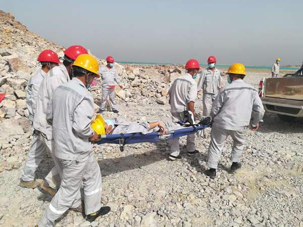 此次演練模擬場景為一名員工從邊坡墜落受傷后的緊急處理過程。接到現場巡視人員報告后,項目部立即啟動應急響應,隨即通知應急救援小組火速趕往事故現場進行救援。警戒疏散組拉起了安全警戒線,封鎖事故現場,維持現場秩序;醫療救護組檢查傷者情況后,對傷員進行了簡單的救治和護理;技術處置組進入高處墜落現場,進行了高處墜落后的安全檢查,預防次生事故;物資保障組馬上聯系了醫院,做好了傷員接收的準備。各小組各司其職,演練現場井然有序,最后救護車輛趕到現場,將傷員送往醫院,演練活動結束。