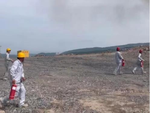 此次演練,災情設定挖掘機在進行焊接作業(yè)時,焊接火花飛濺引燃一旁維修時使用的擦拭油料的棉紗,由于維修位置靠近清表時砍伐的樹木且臨近礦區(qū)邊緣林區(qū),由于當天風勢較大待發(fā)現(xiàn)時被砍伐的樹木已被引燃且火勢洶涌,發(fā)現(xiàn)火災事故的員工立即通知帶班領導。帶班領導接到報告后,立即啟動應急預案,組織人員進行滅火。